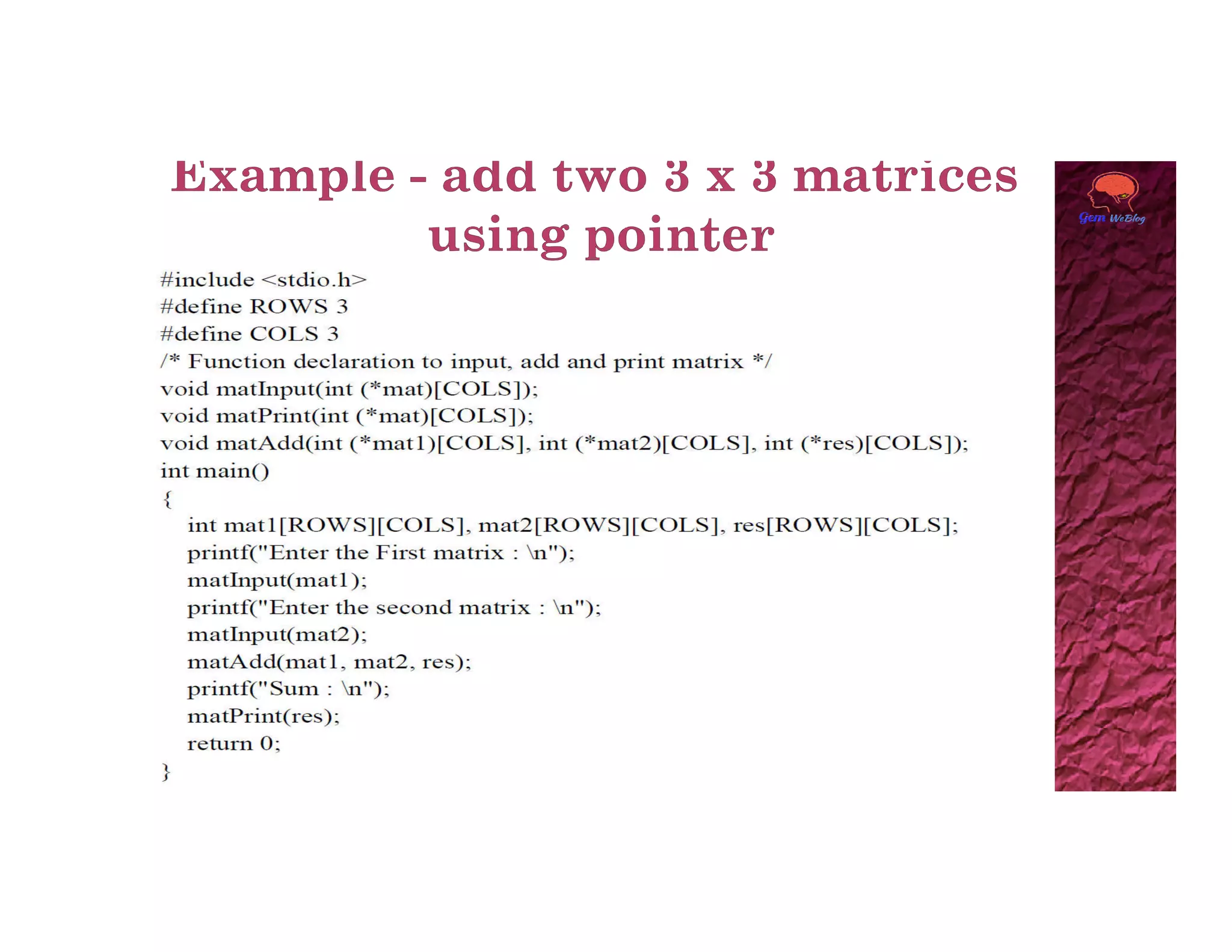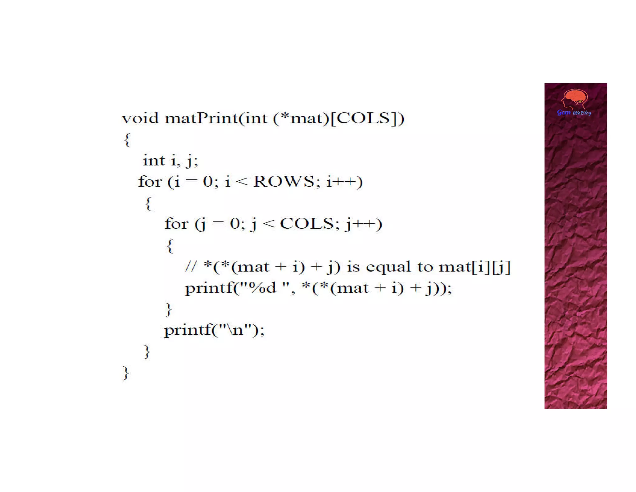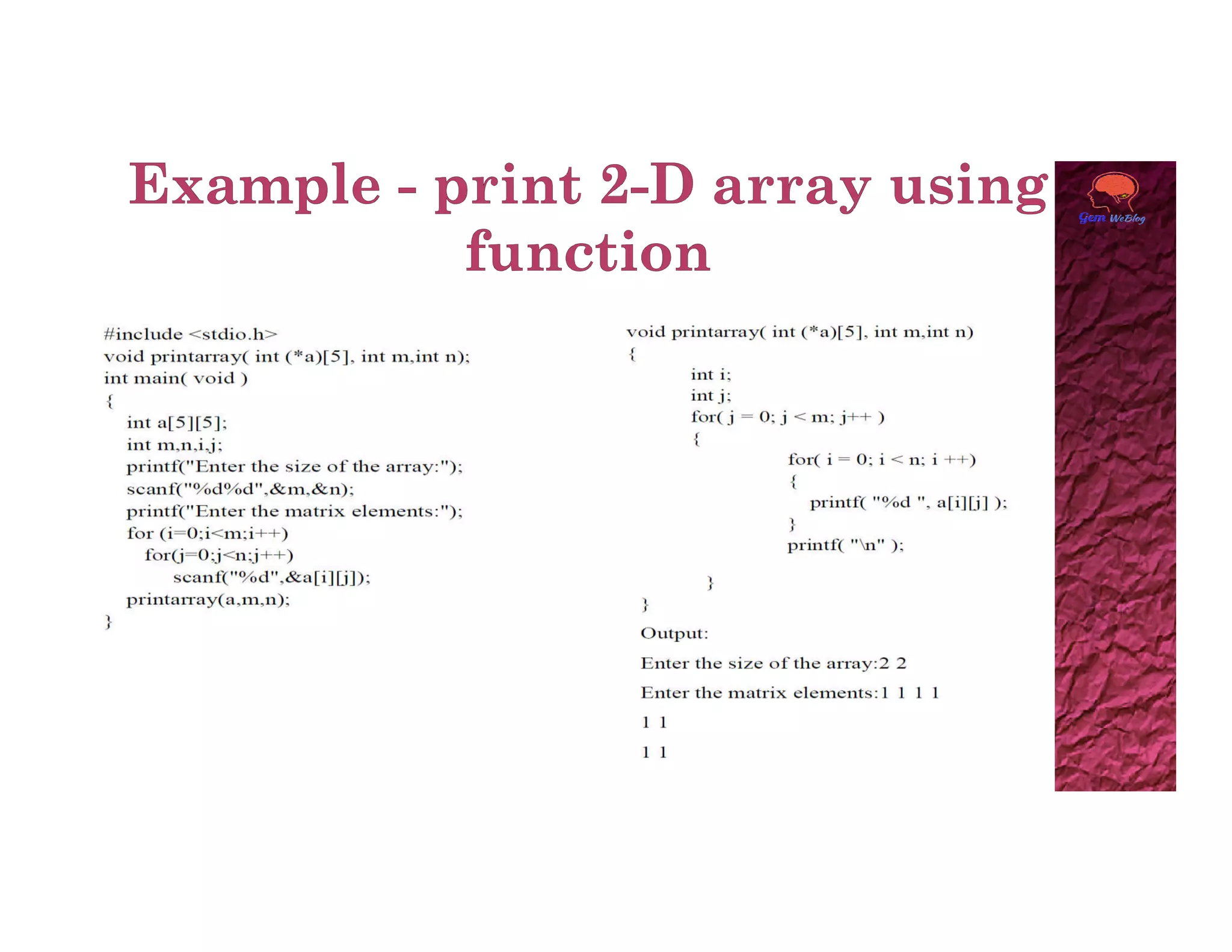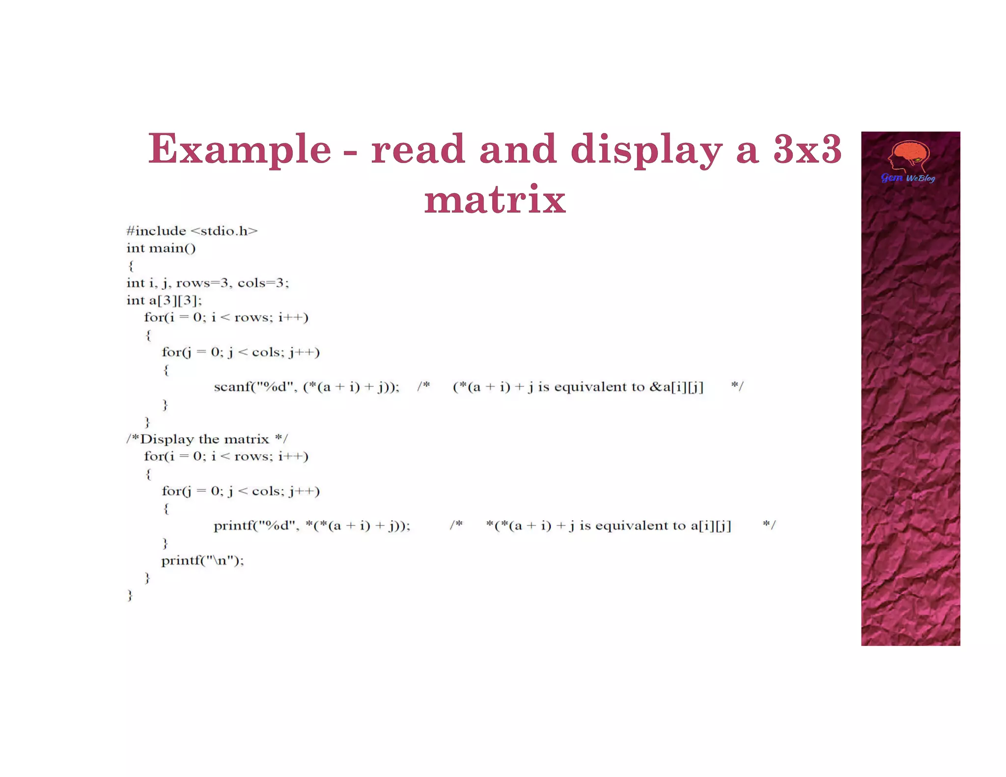 A two dimensional array can be accessed using two subscripts, with the first representing the row number and the second representing the column number. Elements are stored in memory row by row. A 2D array can be viewed as a collection of 1D arrays, with each row representing an array of the second dimension size. The base address of the 2D array points to the first element at index [0][0], and any element can be accessed using the generalized form of base_pointer[i][j].