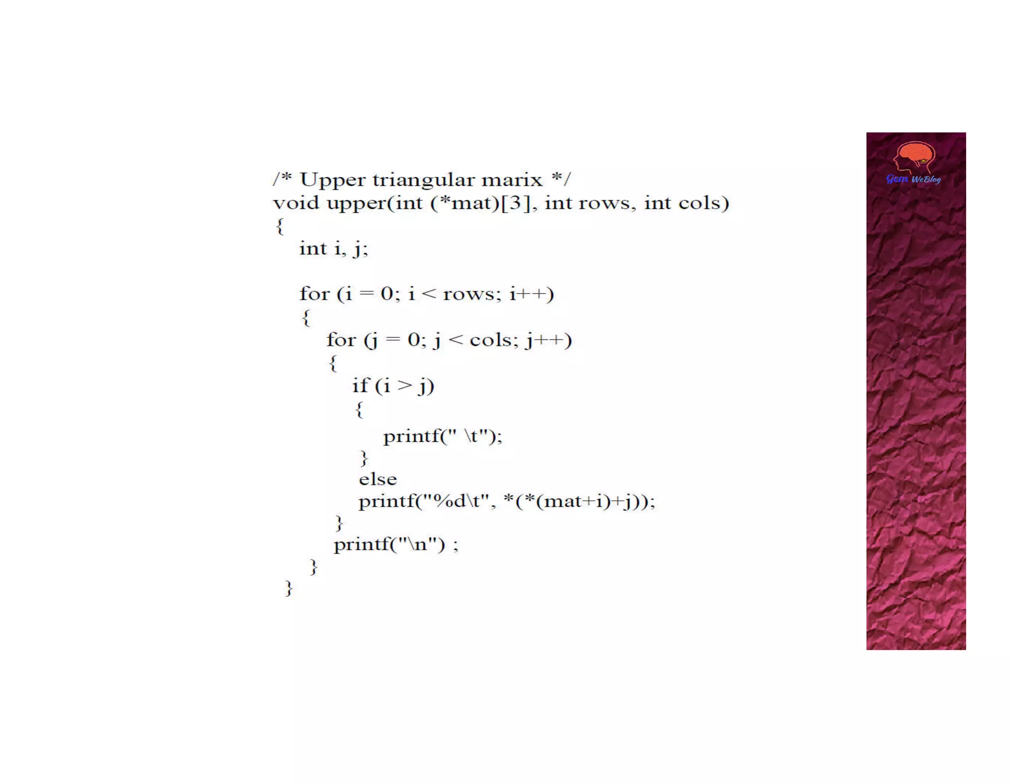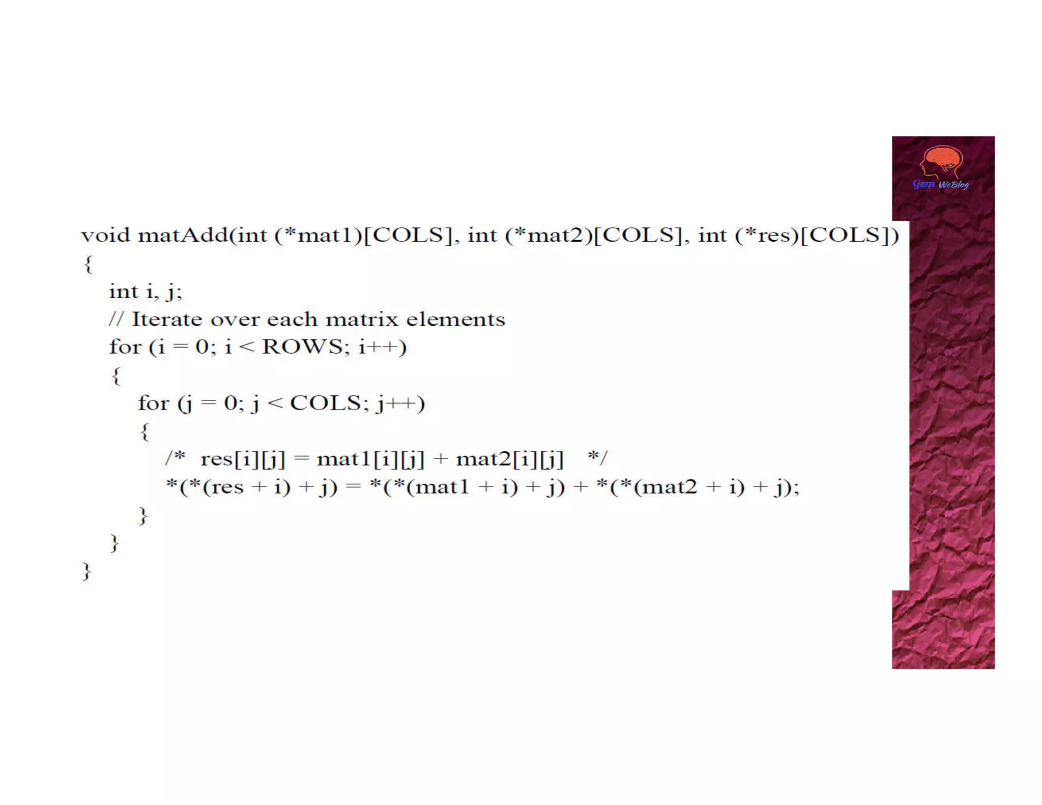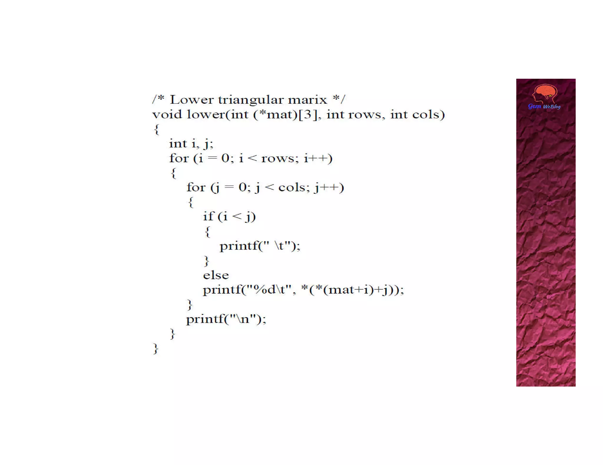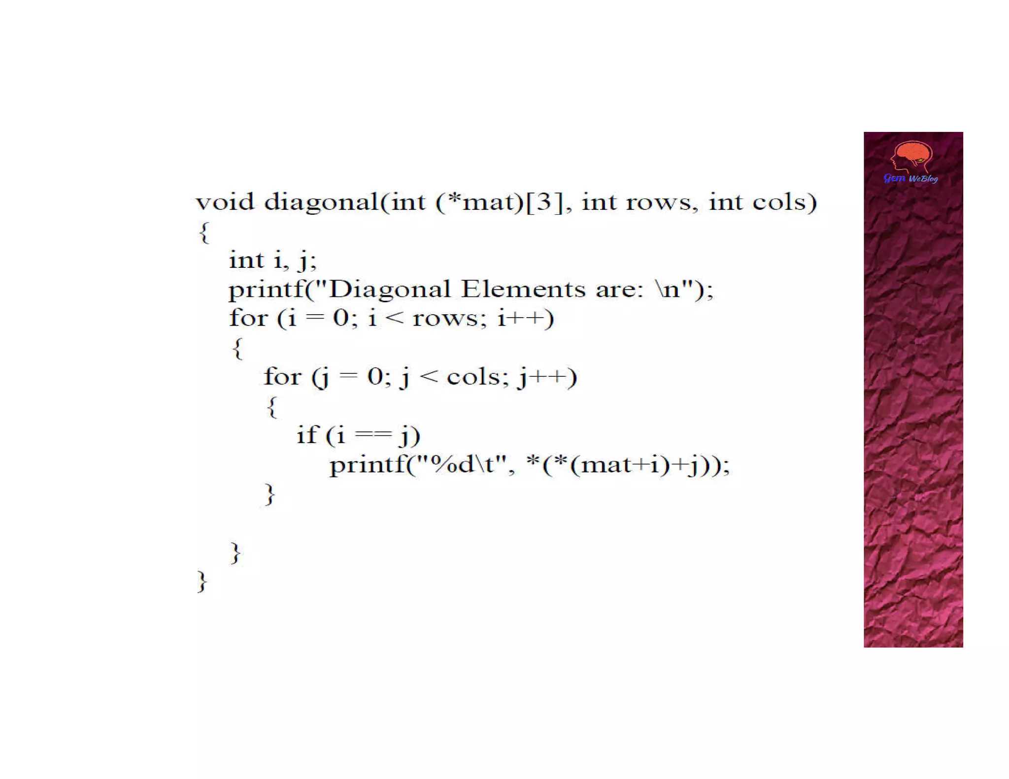 A two dimensional array can be accessed using two subscripts, with the first representing the row number and the second representing the column number. Elements are stored in memory row by row. A 2D array can be viewed as a collection of 1D arrays, with each row representing an array of the second dimension size. The base address of the 2D array points to the first element at index [0][0], and any element can be accessed using the generalized form of base_pointer[i][j].