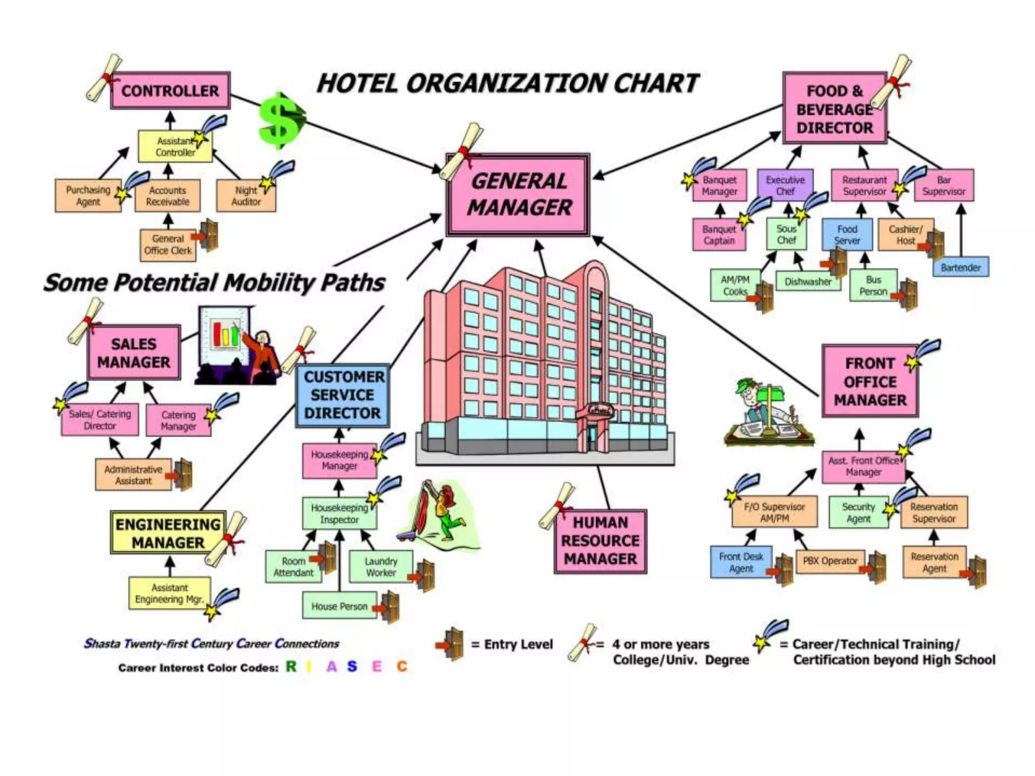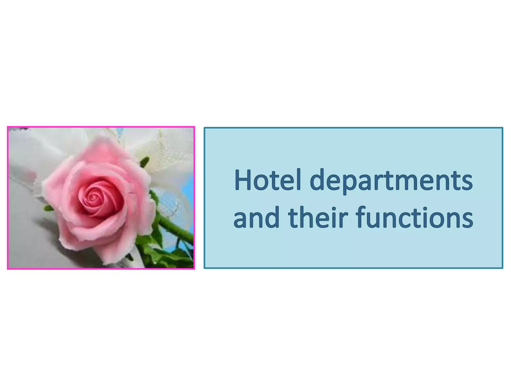 This document provides information about hotel facilities, services, and operations. It discusses the different departments in a hotel including front office, housekeeping, food and beverage. It outlines key facilities like pools, restaurants, and bars. It describes the main functions of food and beverage operations such as purchasing, menu planning, and inventory control. It also gives examples of alcoholic and non-alcoholic beverages. Finally, it provides a sample timeline of times of day.