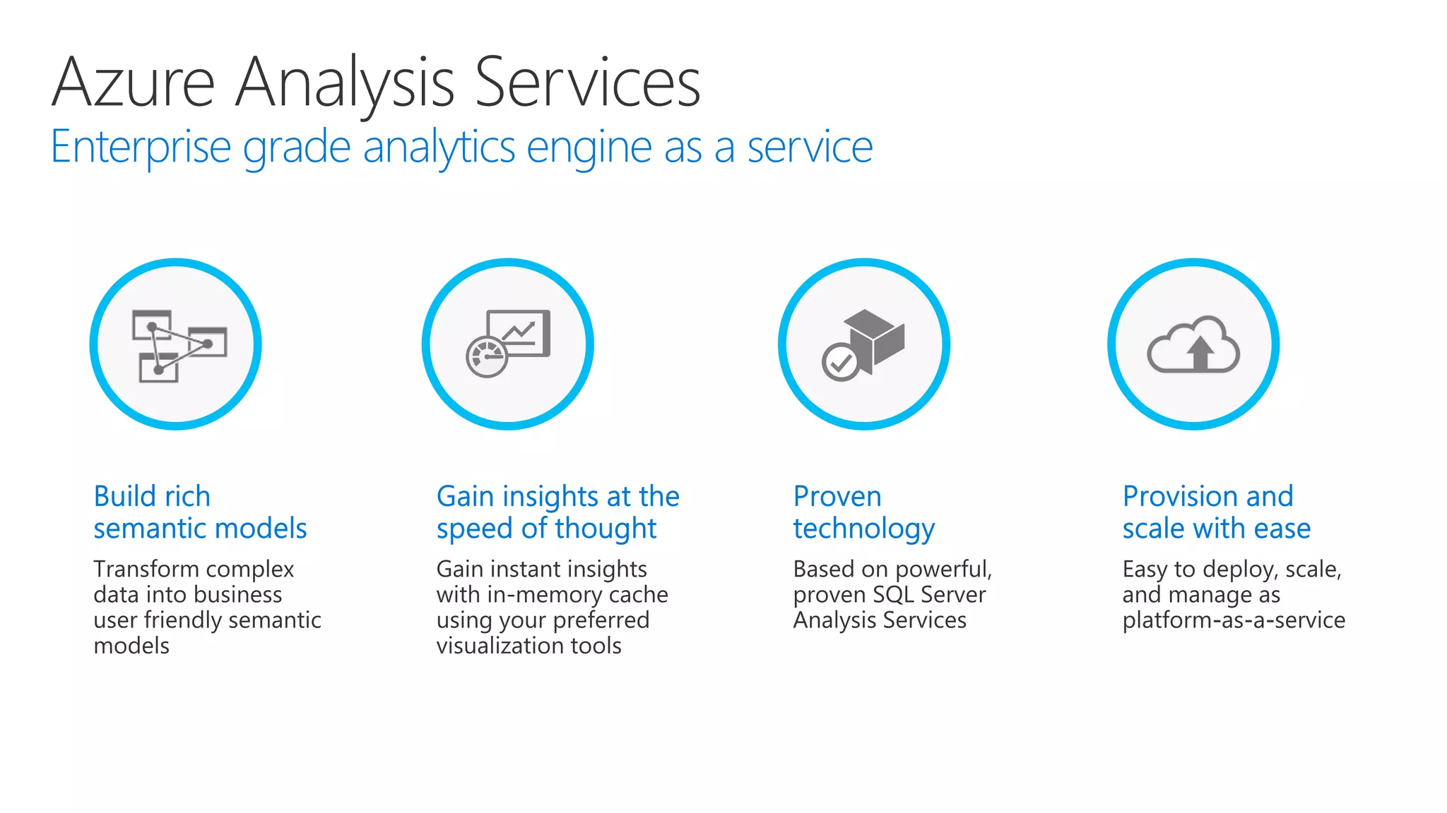 Transform Complex Data into rich BI semantic models: Azure Analysis Services Analysis Services helps you transform complex data into a single business user friendly data model making it easy for business users to understand and analyze data across different data sources.