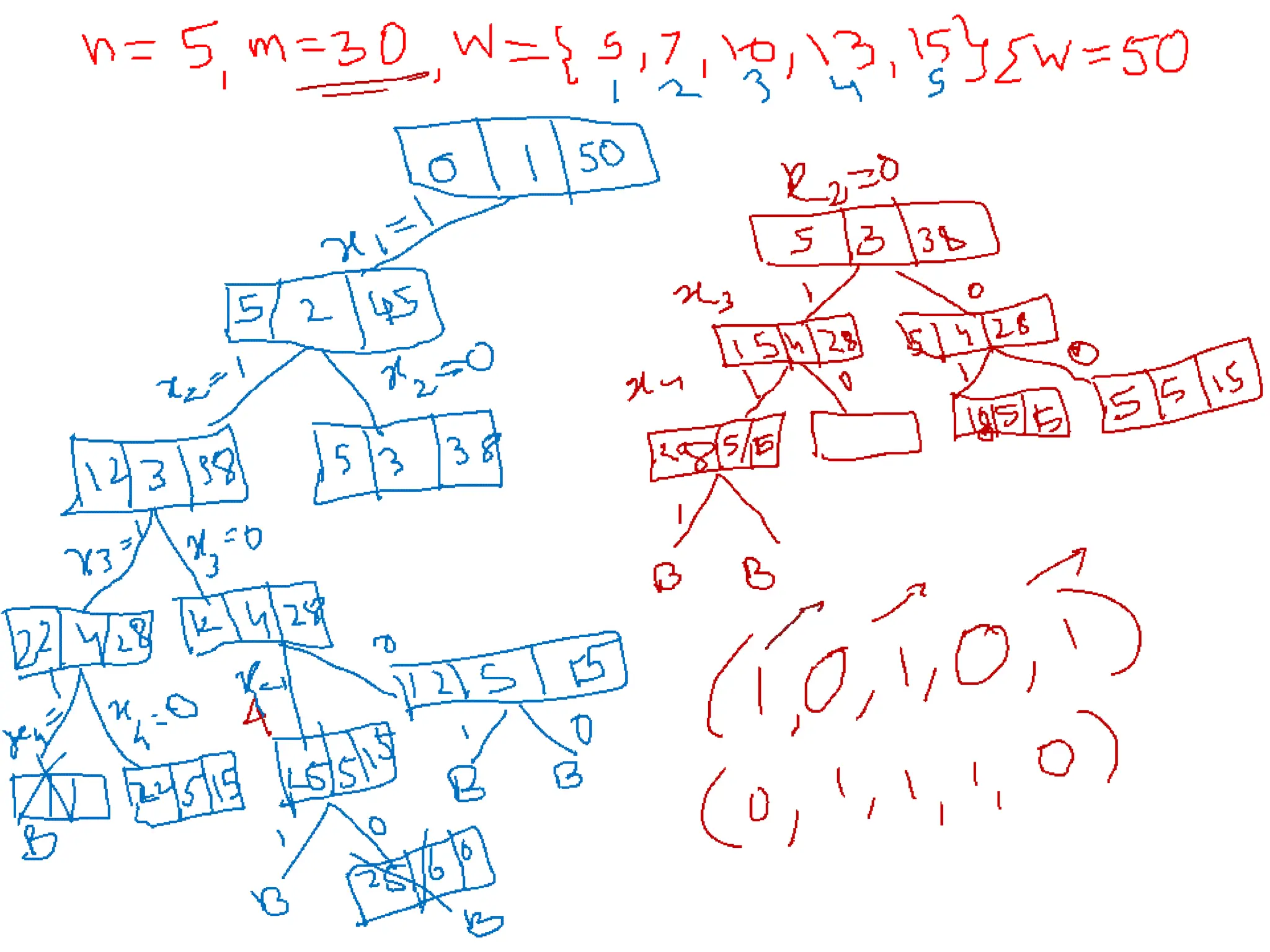 if s+w[k]=m then write x[1..k]