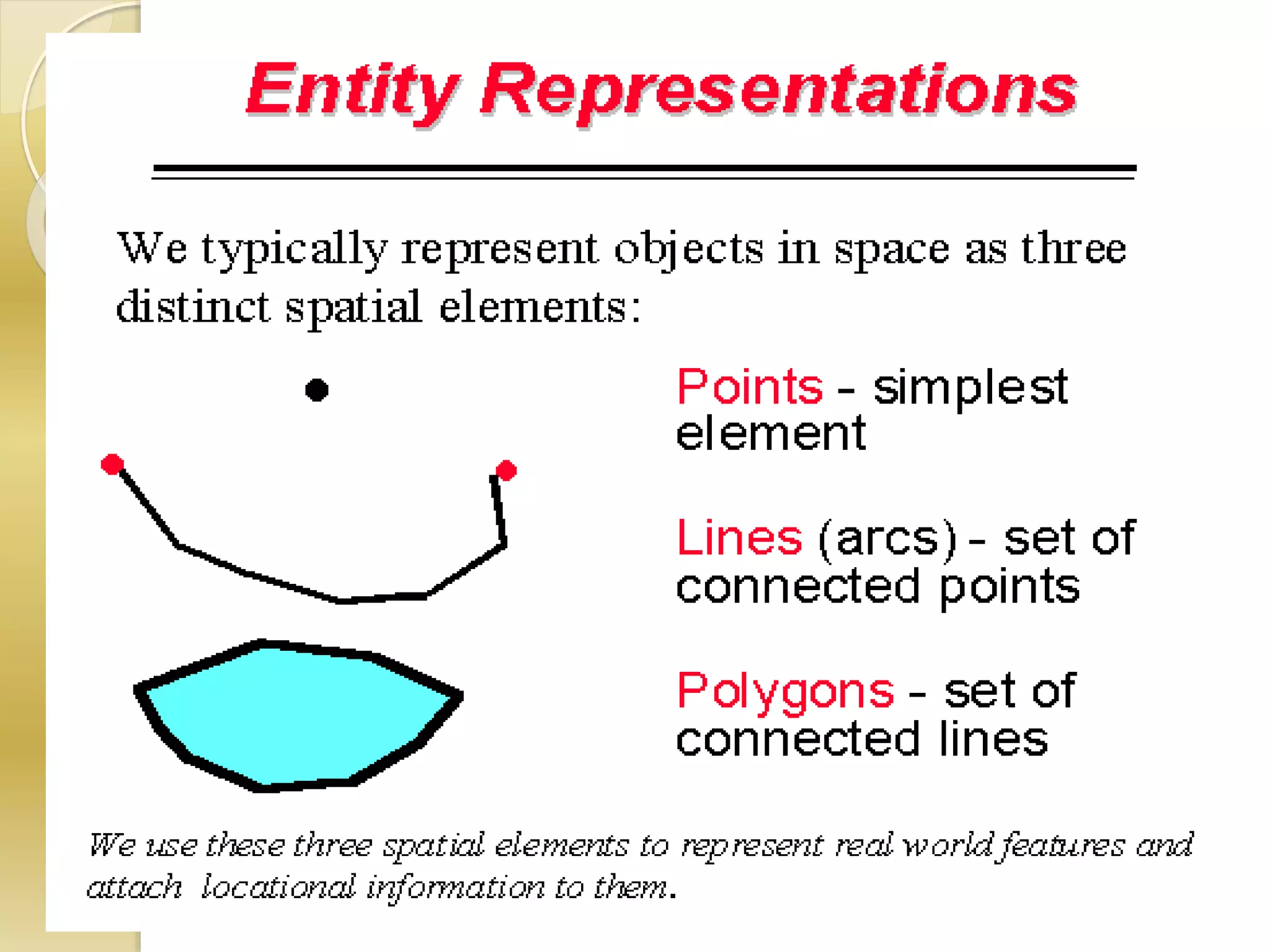 Lines : - Lines represent the shape of geographic objects