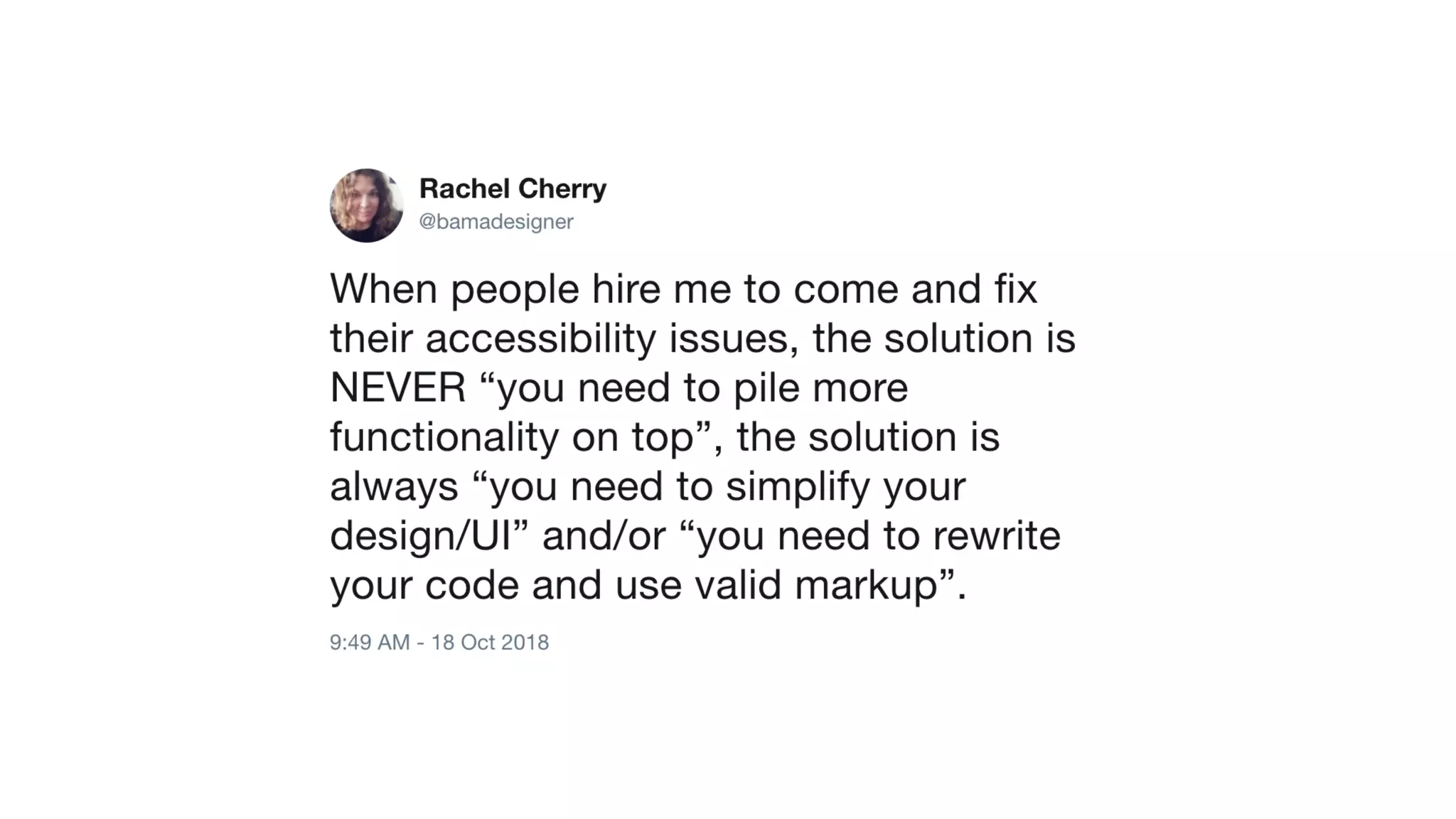 The workshop led by Rachel Cherry focuses on engineering accessible websites, emphasizing the importance of web accessibility for individuals with disabilities. It covers key topics such as WCAG standards, implementing ARIA for assistive technology, and integrating accessibility testing into development workflows. The session underlines that designing for accessibility should be an integral part of web development to enhance user experience for all.
