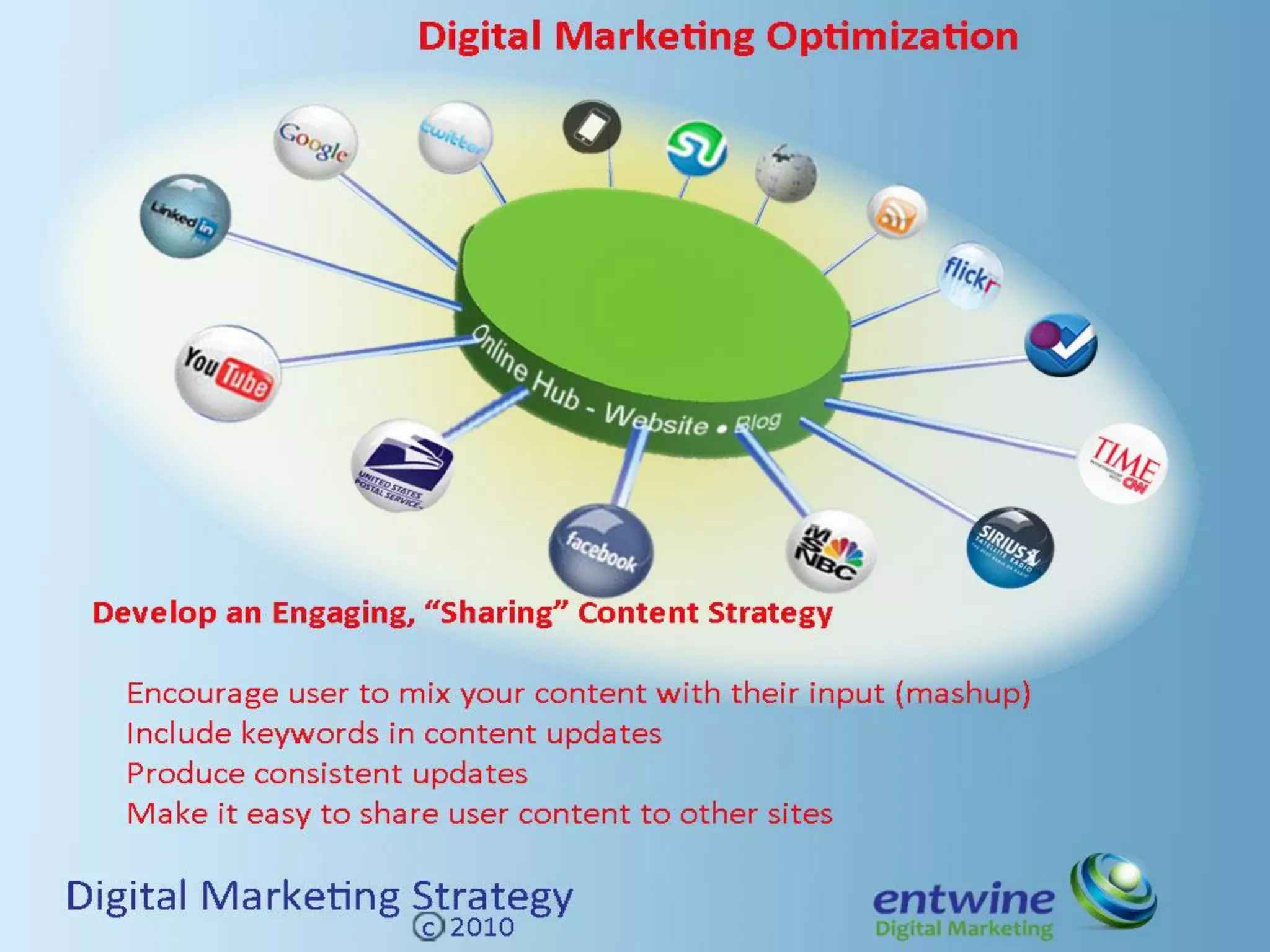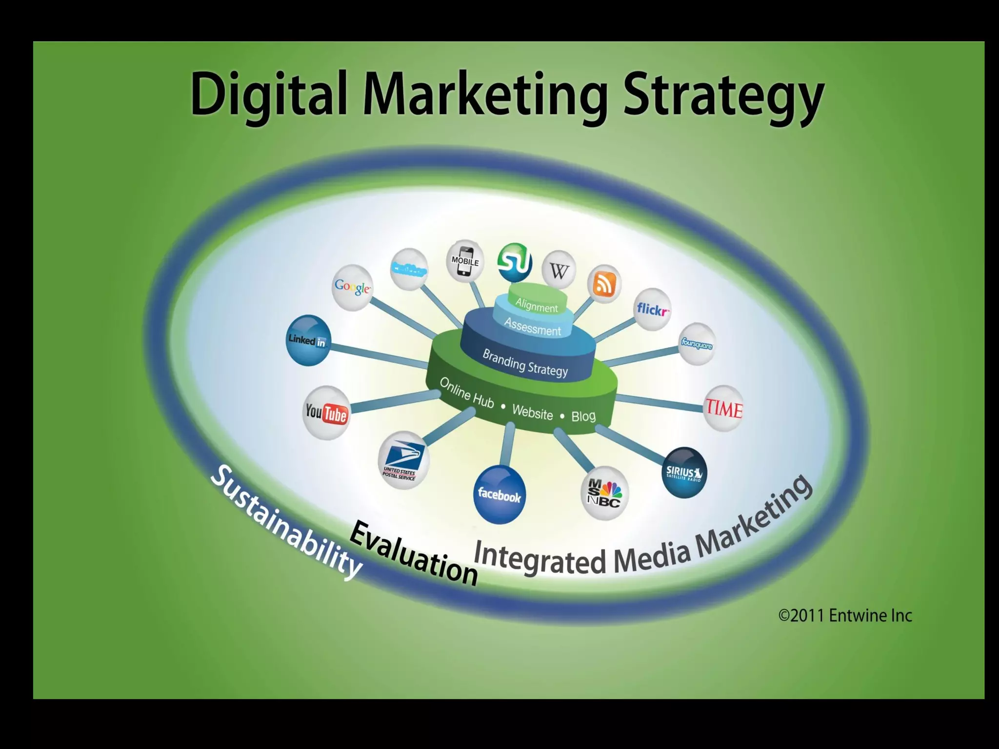 The document discusses integrating digital and social media marketing. It summarizes a survey that found most companies are just beginning to integrate social media into their marketing. The document outlines nine elements companies should integrate, including website design, search engine optimization, mobile optimization, and content management. It emphasizes developing an integrated strategy across all marketing communications and using various social media platforms like Facebook, Twitter, YouTube, and LinkedIn to engage customers and drive traffic.