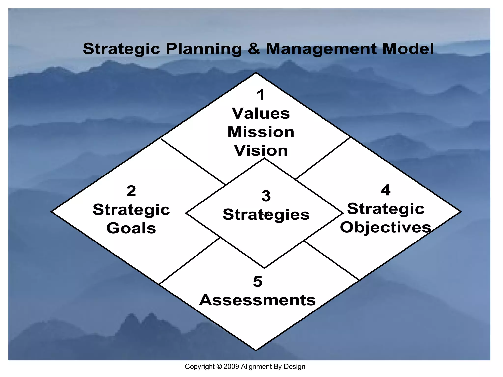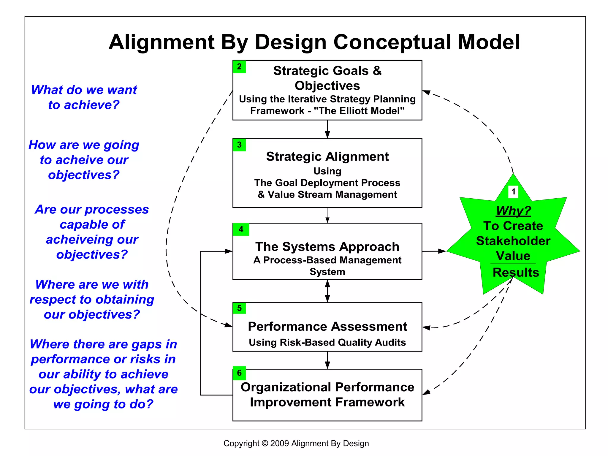 The document introduces the Alignment by Design methodology for organizational effectiveness and excellence. It discusses challenges in the modern business environment and the need for new approaches. The methodology is based on six principles: value creation/sustainment, process-based management, synergy, optimization, envisioning. It presents a conceptual model addressing strategic goals, alignment, process management, performance assessment, and improvement. The goal is to continually create optimal value for stakeholders through strategy, process management, and performance improvement initiatives.