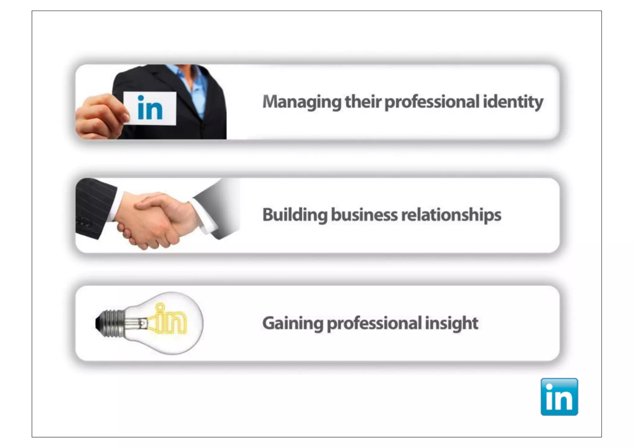 LinkedIn is a professional networking platform that has over 800+ million connections worldwide. It allows professionals to establish and manage their online identity, be visible to recruiters and connections, and gain business insights. LinkedIn has changed how companies find and attract talent, with 99% using it for recruitment compared to 59% for Facebook and 42% for Twitter. It provides tools for advanced searching of profiles, skills, companies, and staying up-to-date on business news and trends to help professionals make faster and better career decisions and find new opportunities in a changing job market.