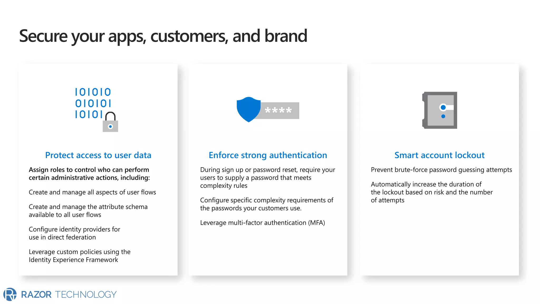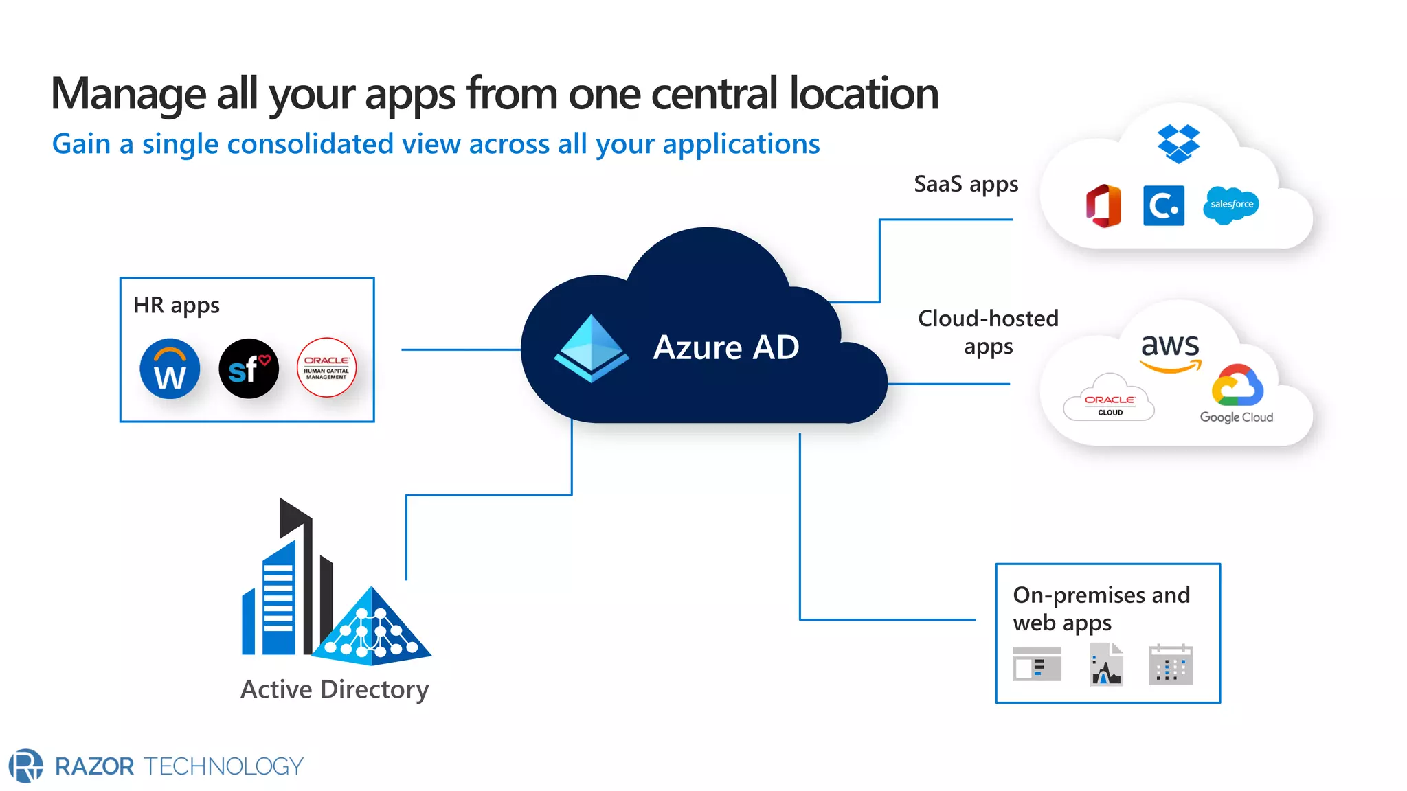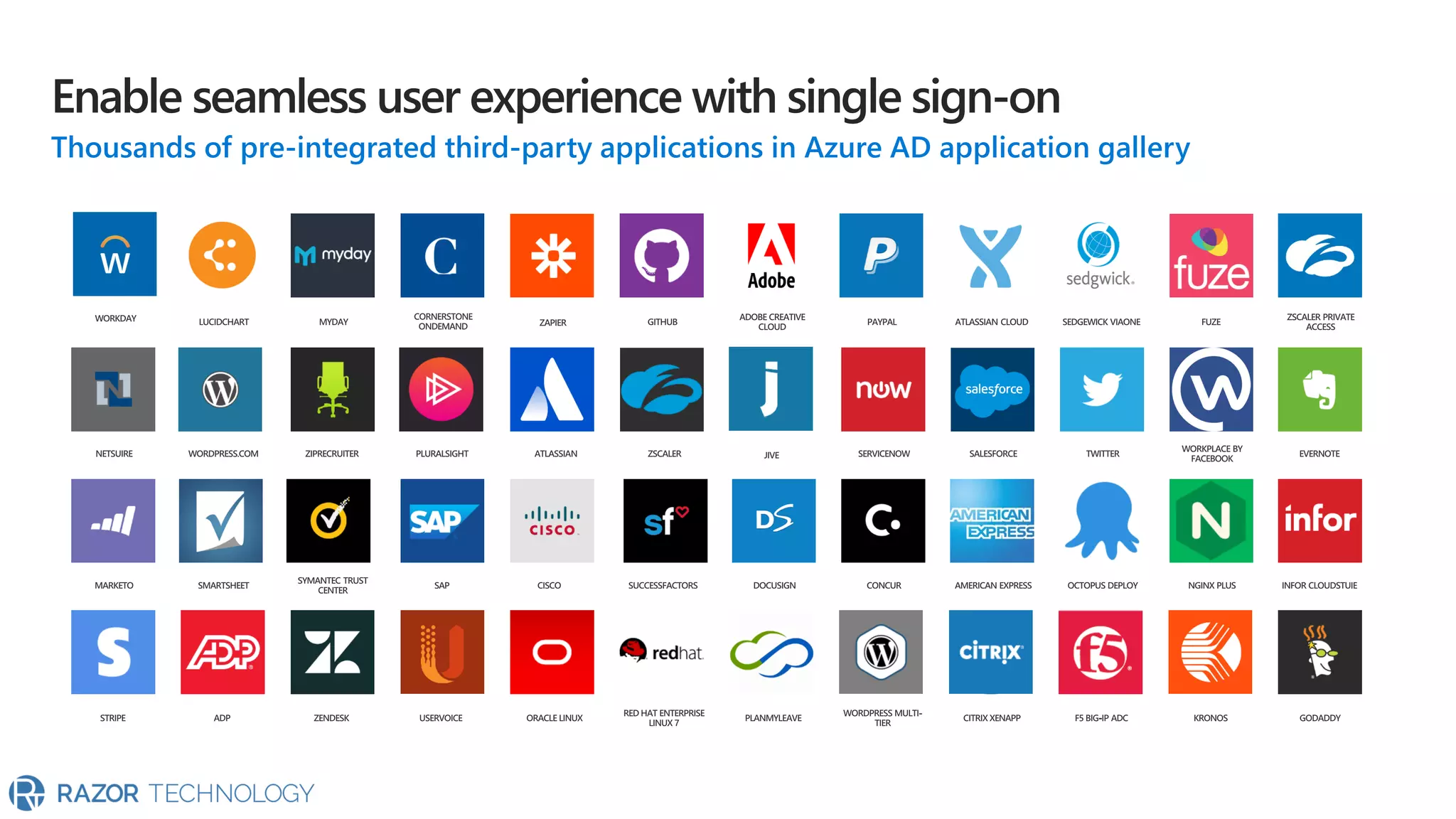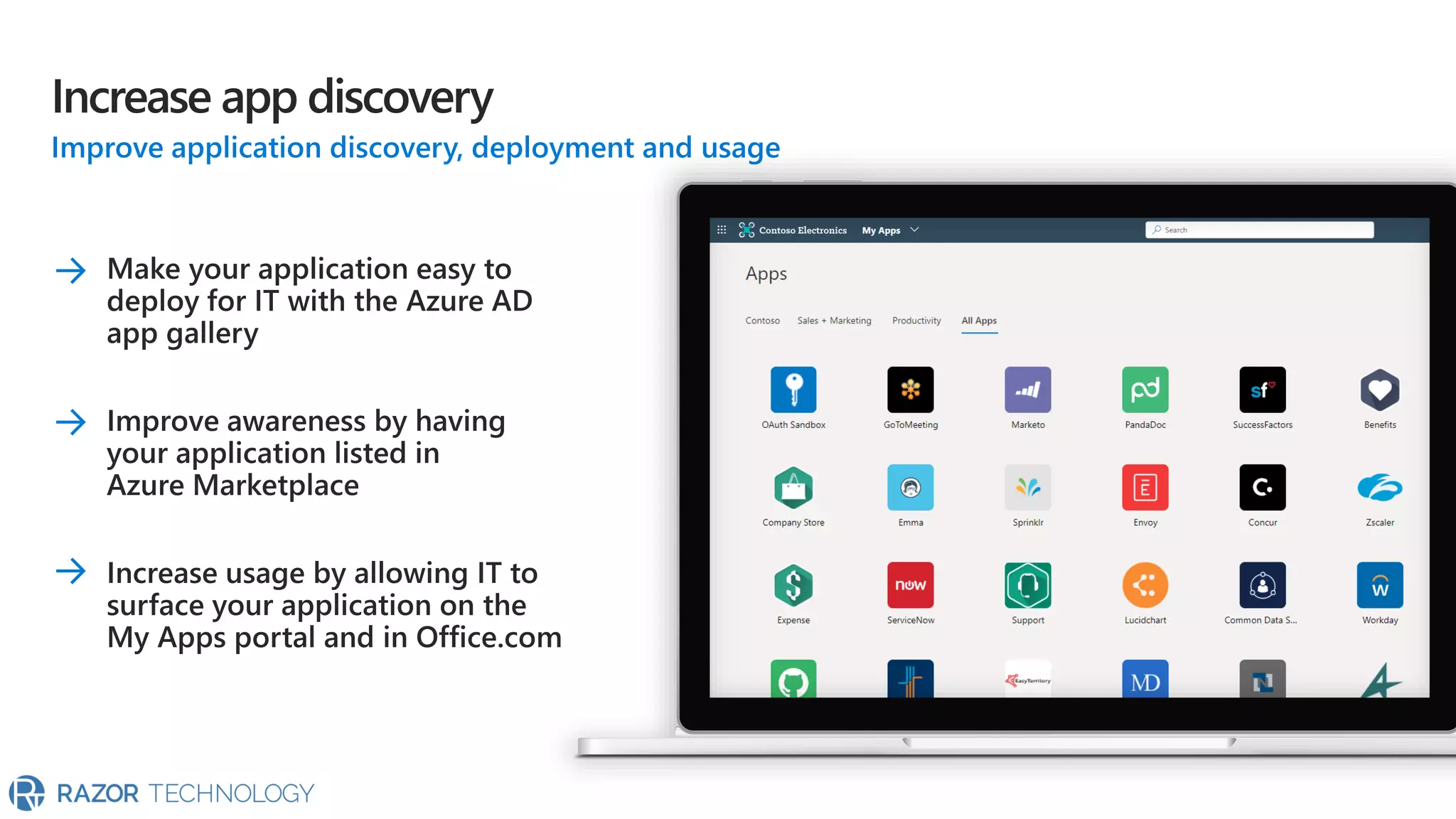 The document highlights the significant growth of active apps, exceeding 2 million with over 100% year-on-year growth as of October 2019. It mentions the use of cloud SaaS apps for securing and maintaining compliance for applications, customers, and brands. For more information, contact Razor Technology or visit their website.