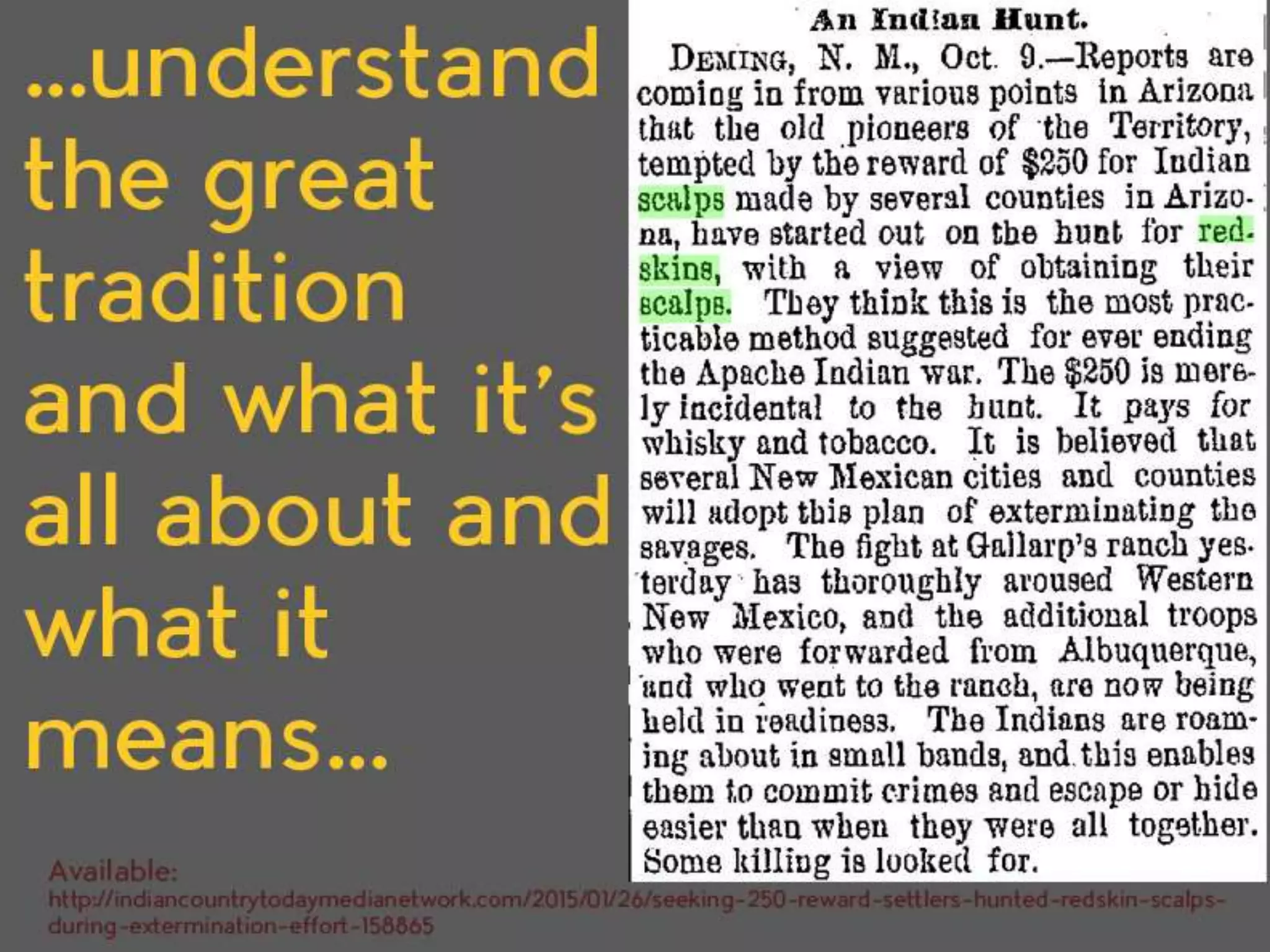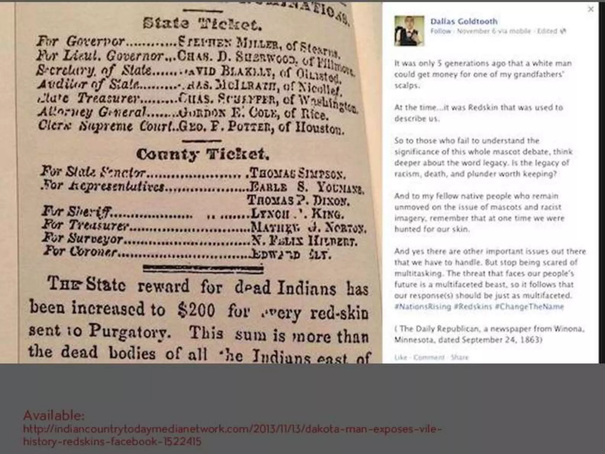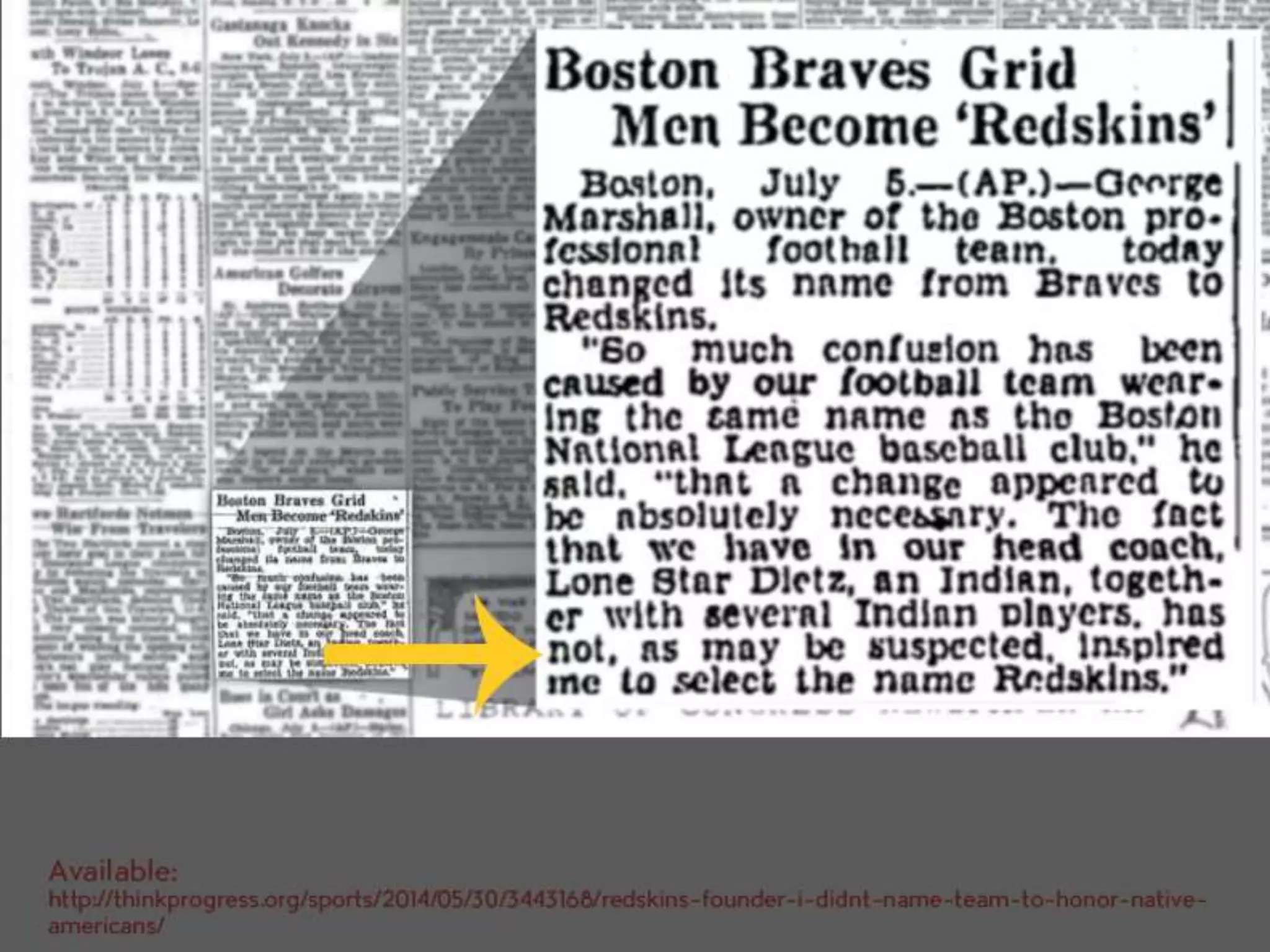 The document discusses the history and origins of the Washington Redskins logo and name. It notes that while the team claims the name was chosen in the 1930s to honor their coach and Native American players, the term "redskin" has a historical legacy as a racial slur. The logo itself has changed over time but has featured Native American imagery since the 1960s. The document argues the issue is more complex, as many believe the narratives around the logo representing strength and tradition, and calls for more accurate historical education and inclusion of Native American voices in the discussion.