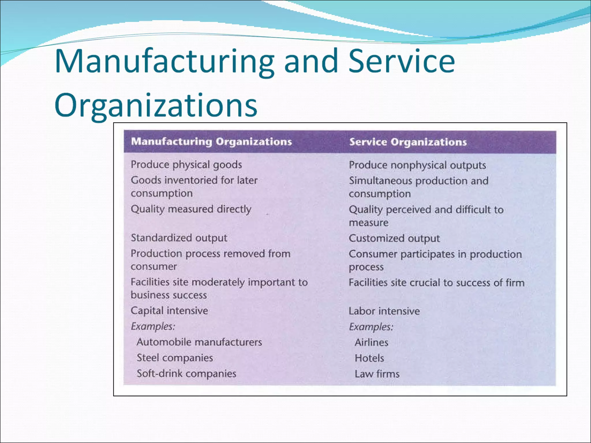 Differences between Manufacturersand Service Operations Services: Intangible product Product cannot be inventoried High customer contact Short response time Labor intensive Manufacturers: Tangible product Product can be inventoried Low customer contact Longer response time Capital intensive