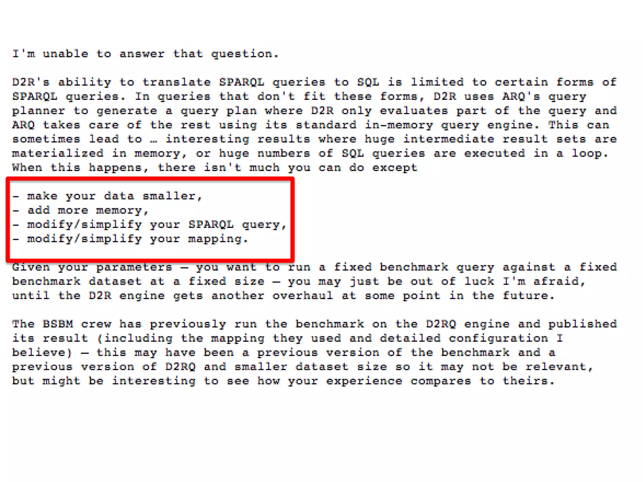 #223 A first implementation naively represented the relational data as RDF using only three columnsWe observe that the preconditions for applying optimizations were not being satisfied Indexes were not being exploited