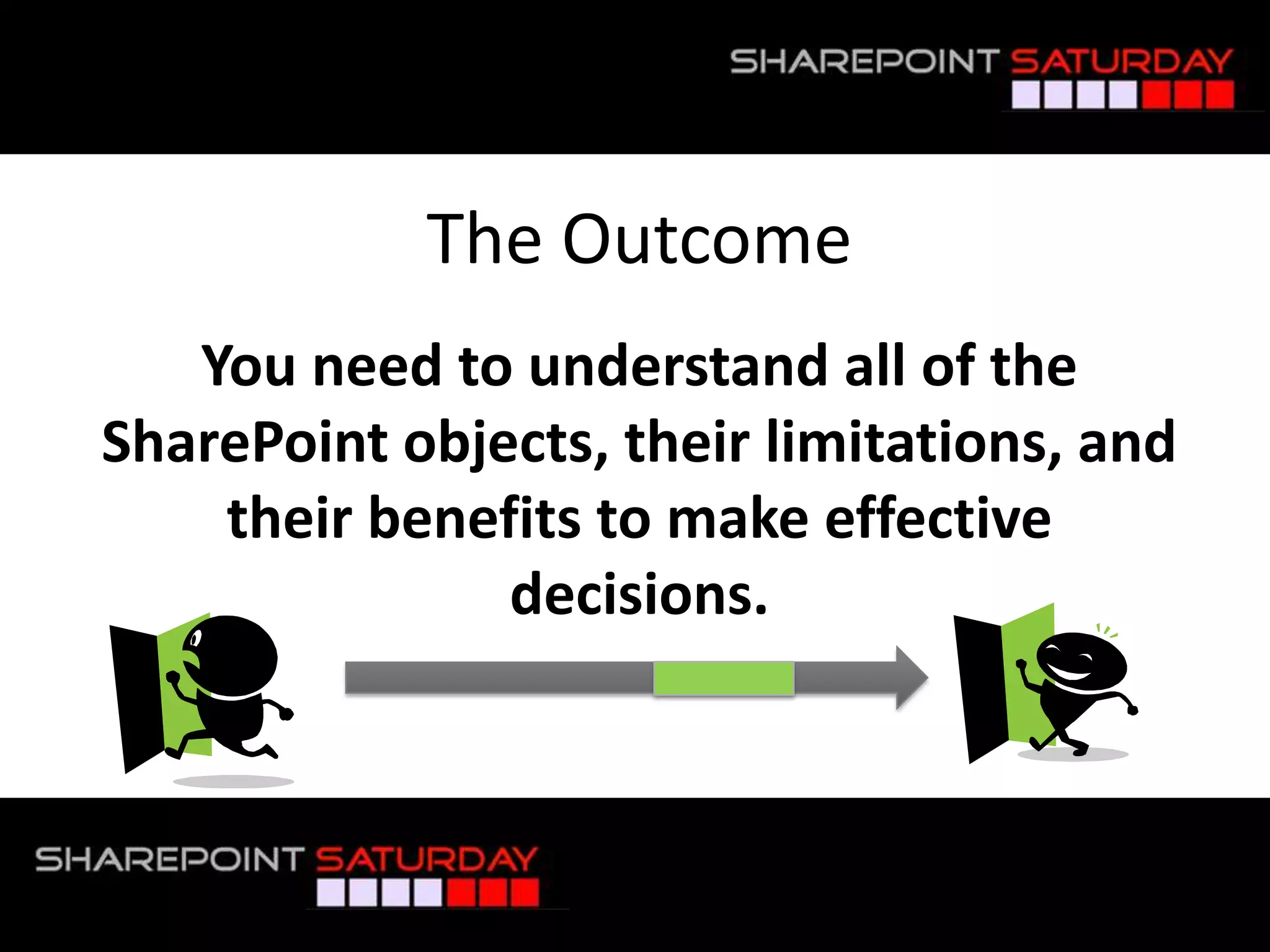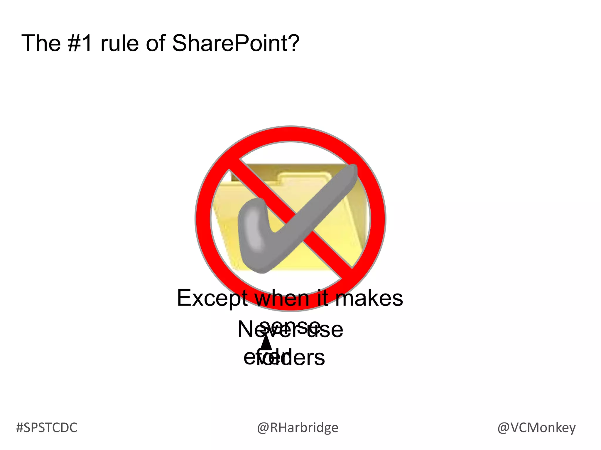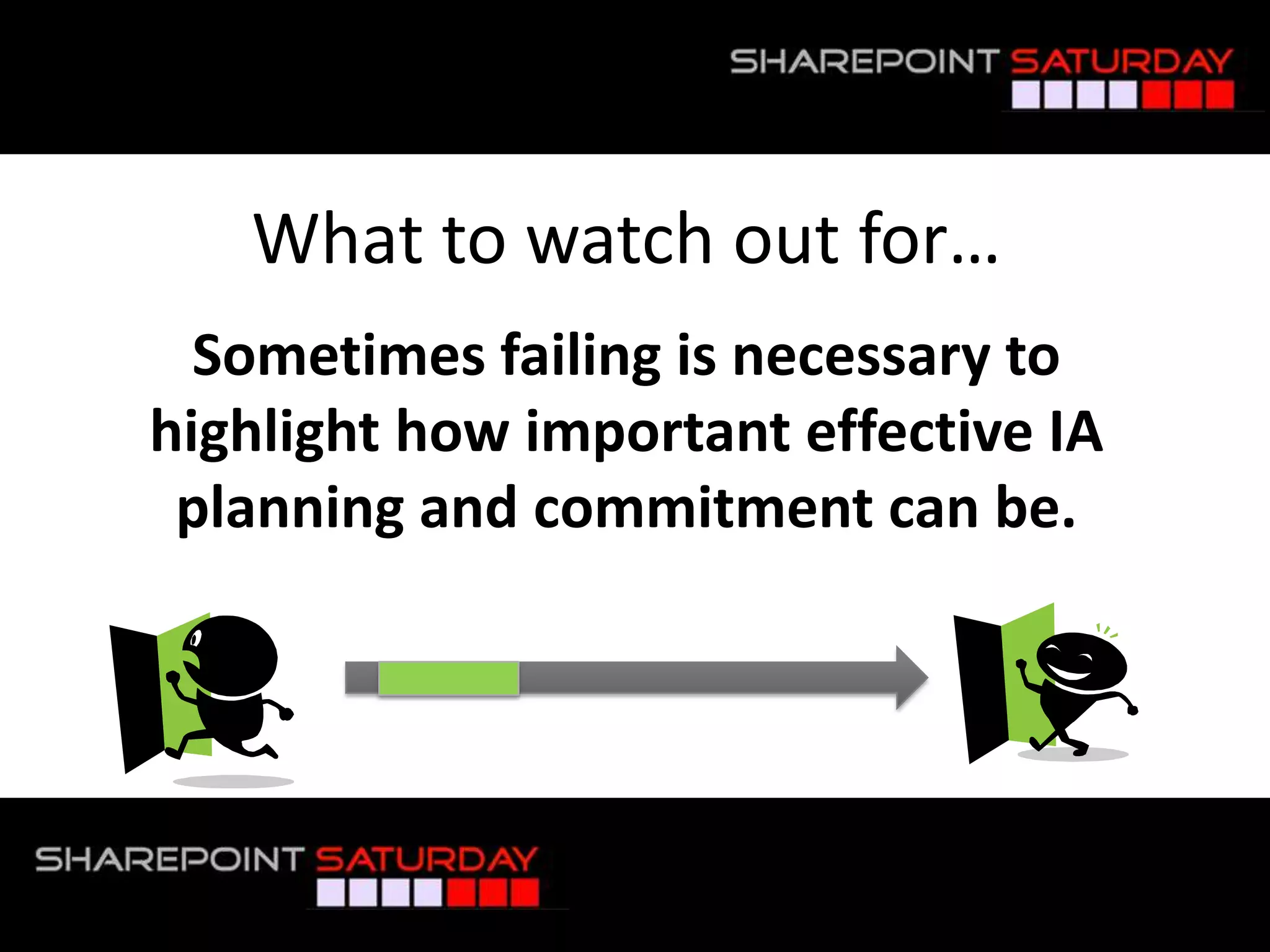 The document summarizes a presentation on information architecture for SharePoint systems. It discusses why SharePoint information systems often fail due to lack of planning, not understanding how business works, thinking the org chart is the site map, relying on Microsoft for design instead of users, and not reviewing usage. It then covers what makes an effective IA strategy, including understanding context, users, and content. It also discusses visualizing and communicating IA concepts through taxonomy, metadata, labeling, navigation systems, and card sorting techniques. The presentation aims to provide tips and strategies for developing an information architecture that works.