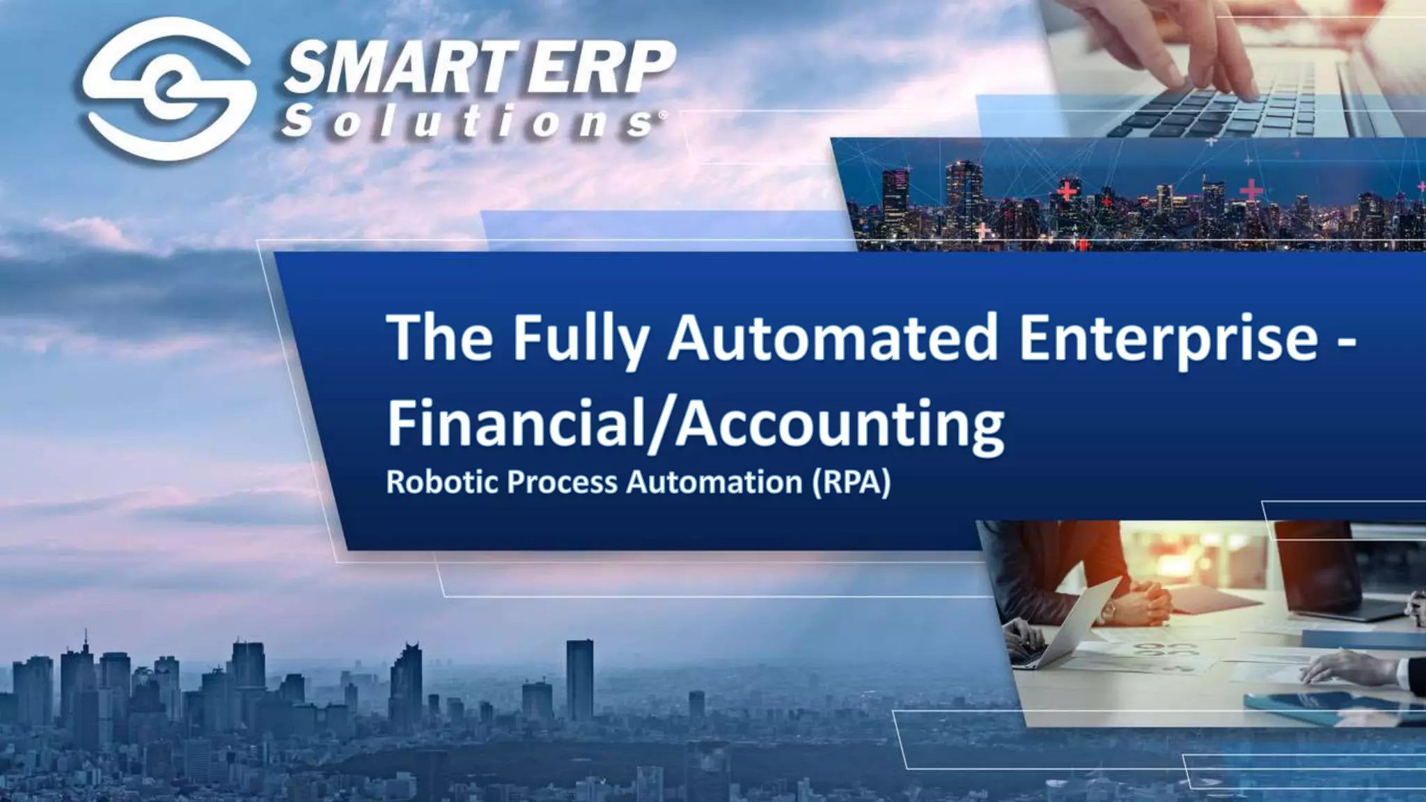 The document discusses Robotic Process Automation (RPA) and its applications in finance and accounting. It provides examples of common repetitive tasks in finance and accounting that can be automated using RPA such as accounts receivable processing, accounts payable processing, and invoice processing. The benefits of RPA implementation are also summarized, including improved efficiency, reduced costs, improved data quality, and regulatory compliance. SmartERP's RPA services and platforms that use artificial intelligence to enable automation across business processes are also highlighted.