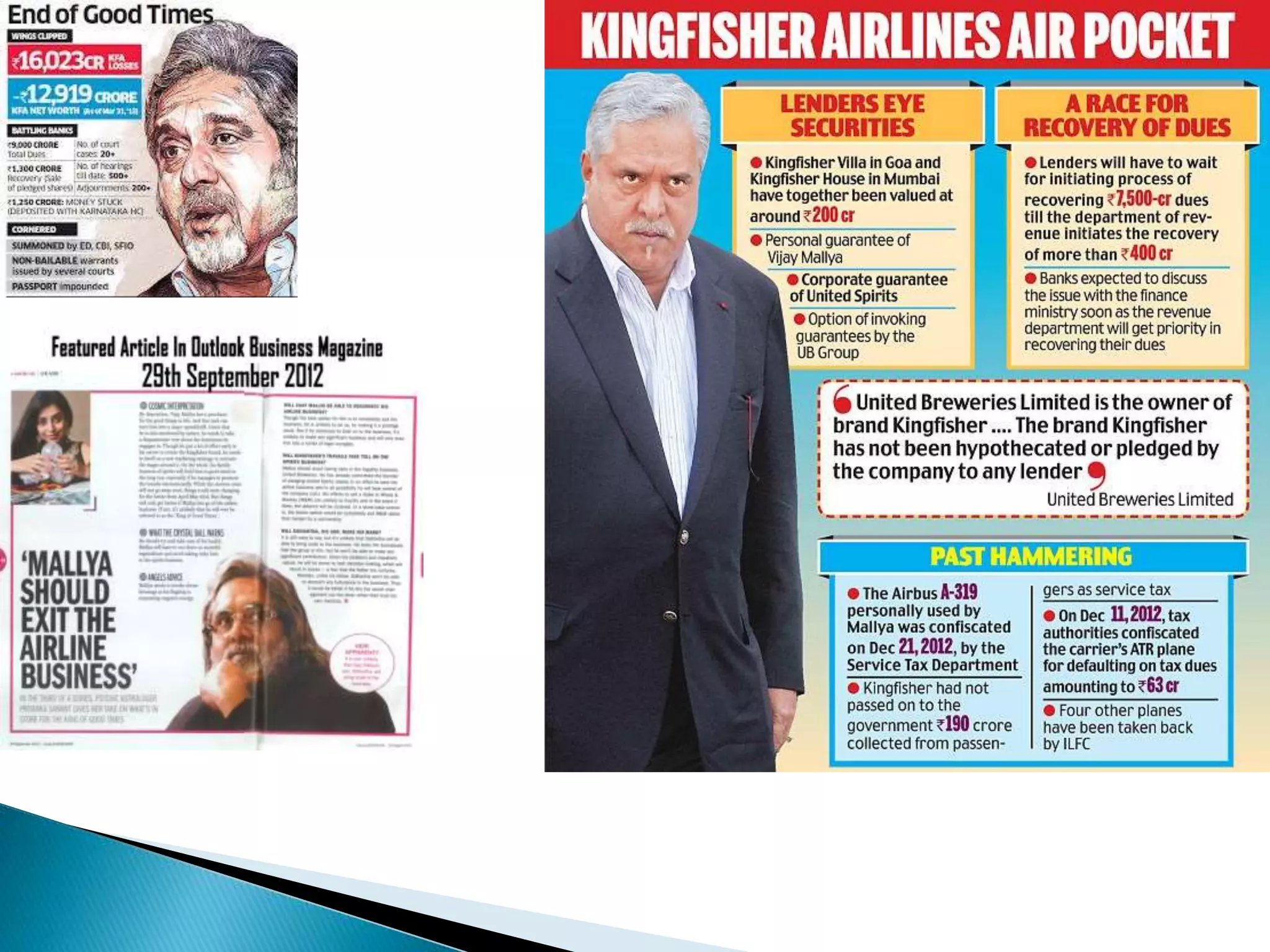 This document discusses Vijay Mallya and Kingfisher Airlines' default on over Rs. 9,000 crore in loans to banks. It details Mallya's business empire and the rise and fall of Kingfisher Airlines, which began operations in 2005 but struggled due to high costs and prices. While Mallya has offered to pay back Rs. 4,000 crore, banks have only recovered around Rs. 1,600 crore by selling collateral such as shares in United Spirits. The document also analyzes loopholes in laws like SARFAESI that have hindered further recovery from Mallya.