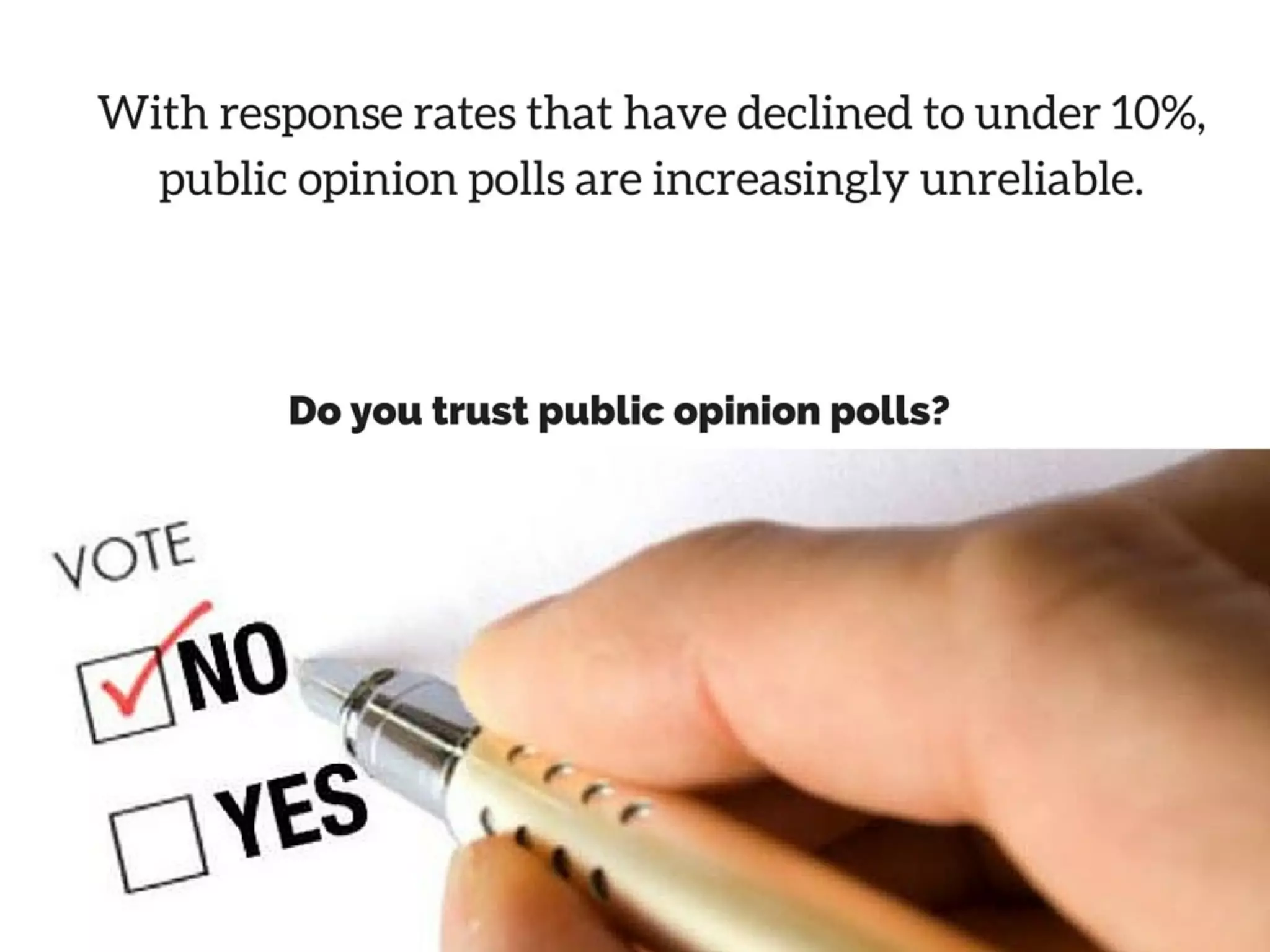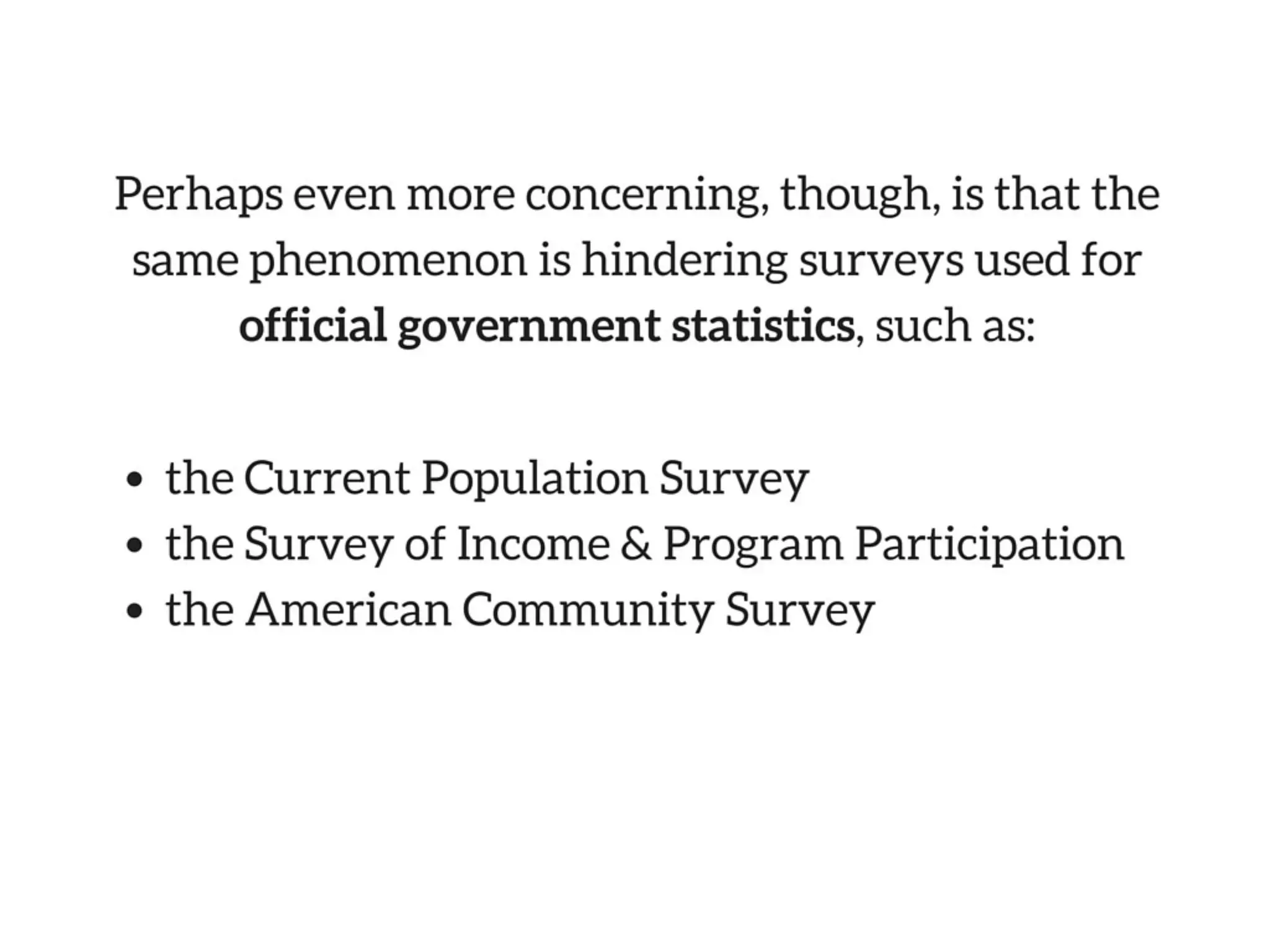 With response rates that have declined to under 10 percent, public opinion polls are increasingly unreliable. Perhaps even more concerning, though, is that the same phenomenon is hindering surveys used for official government statistics, including the Current Population Survey, the Survey of Income and Program Participation and the American Community Survey.