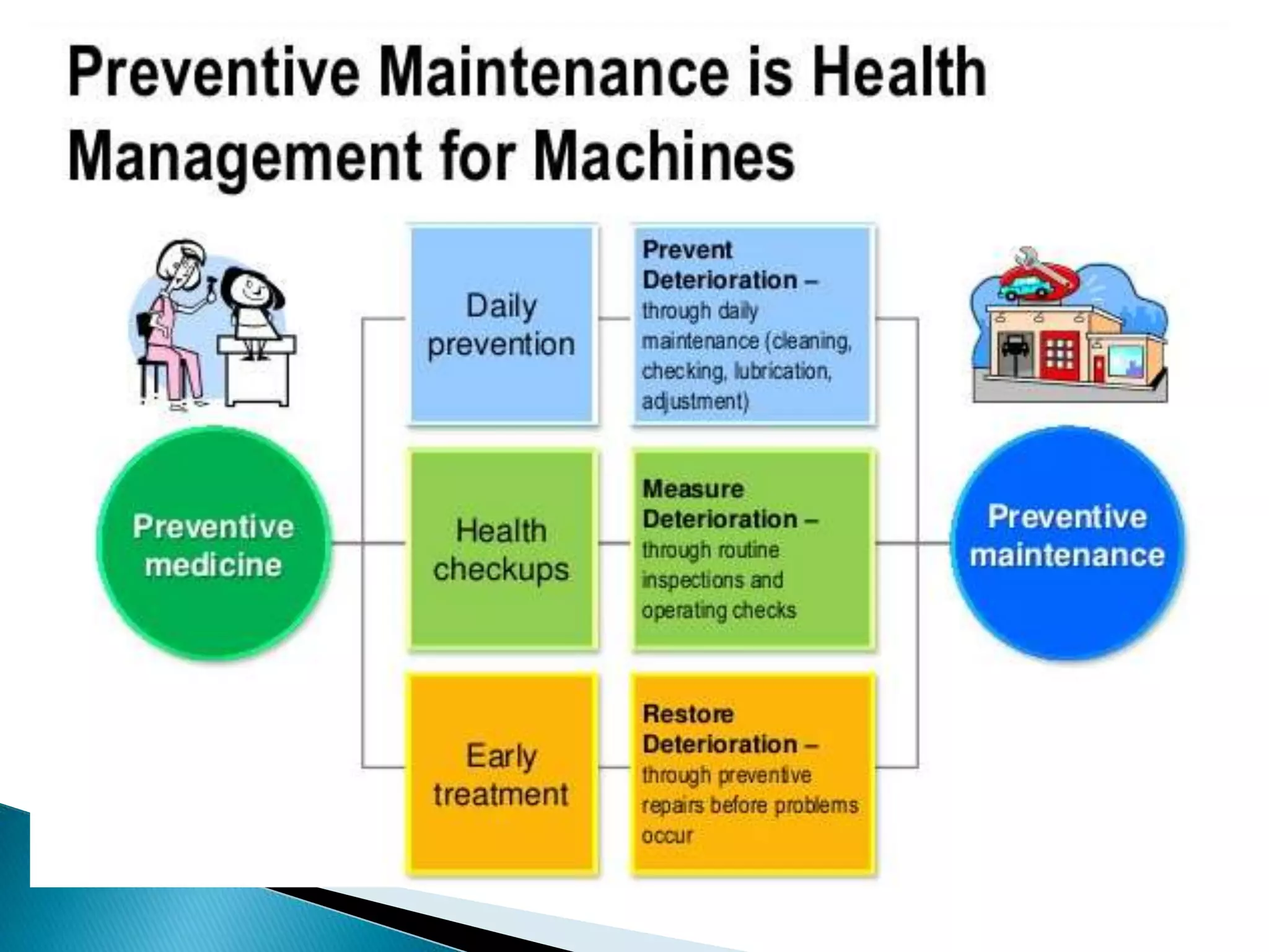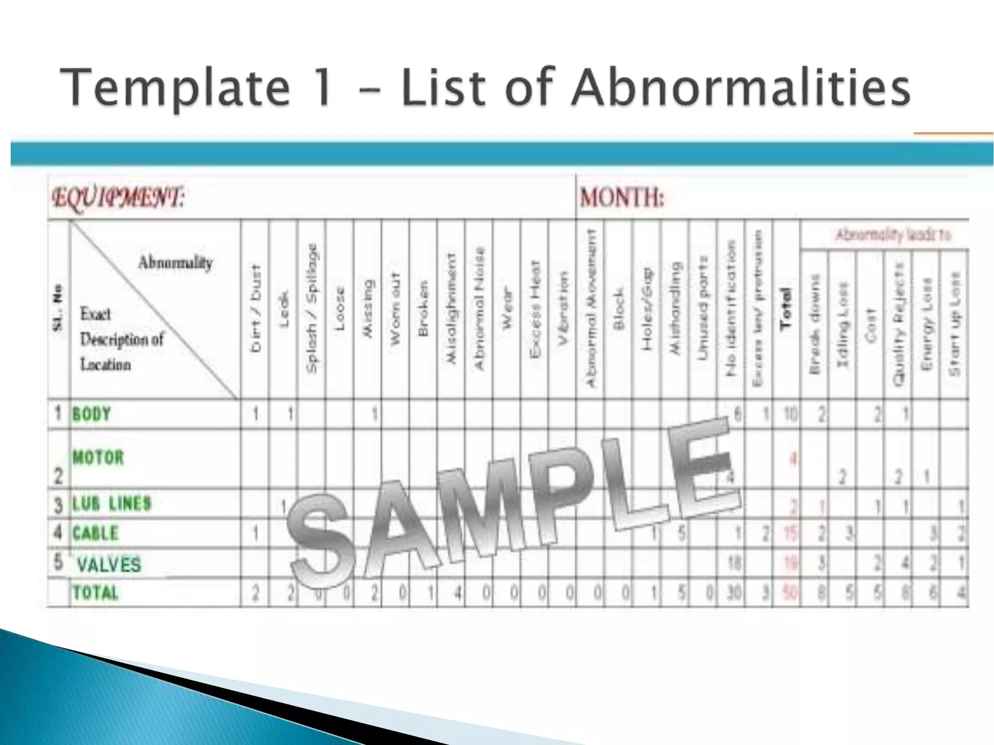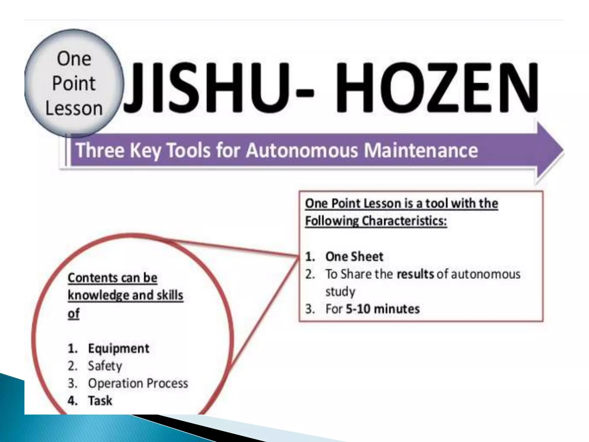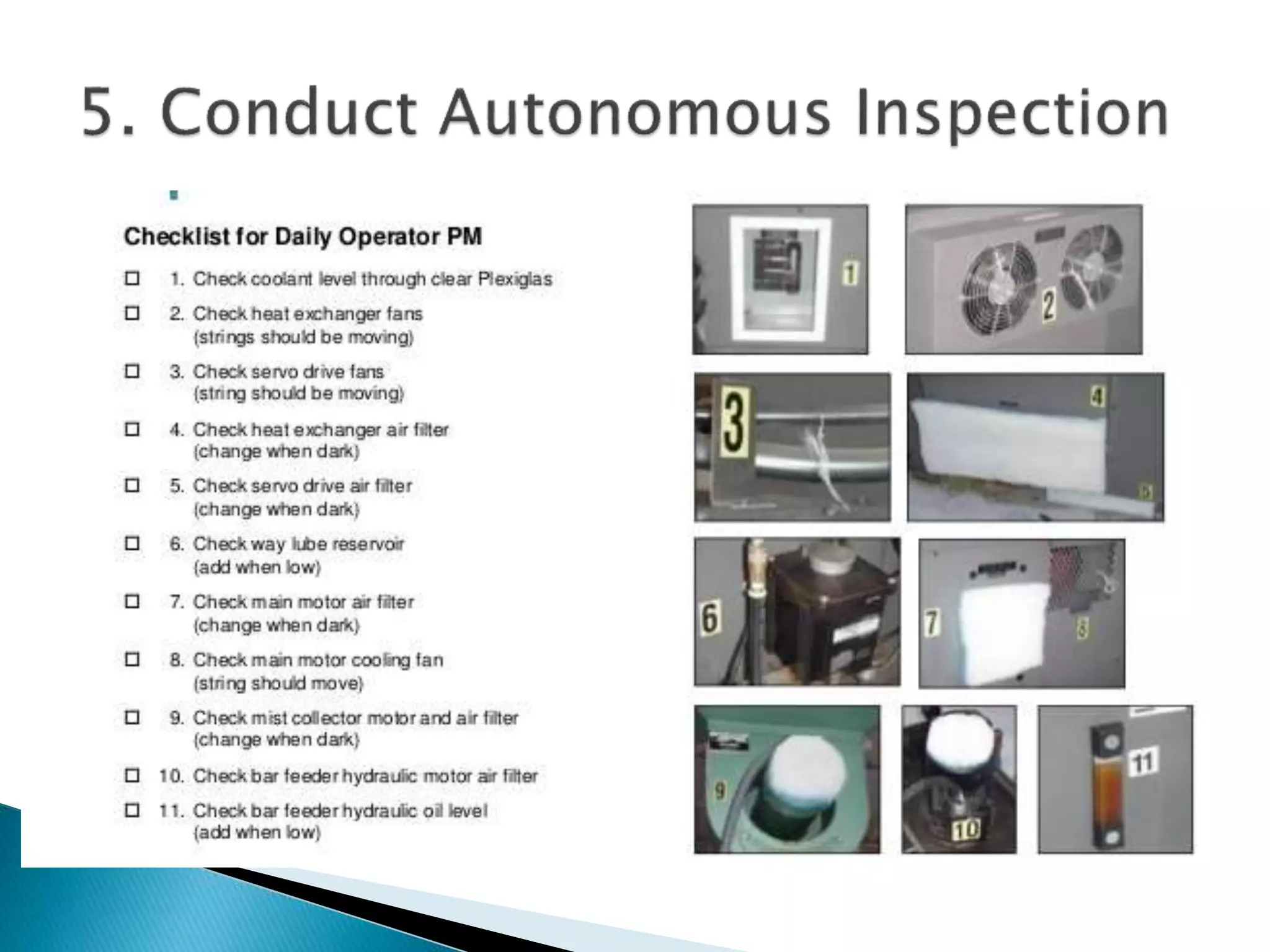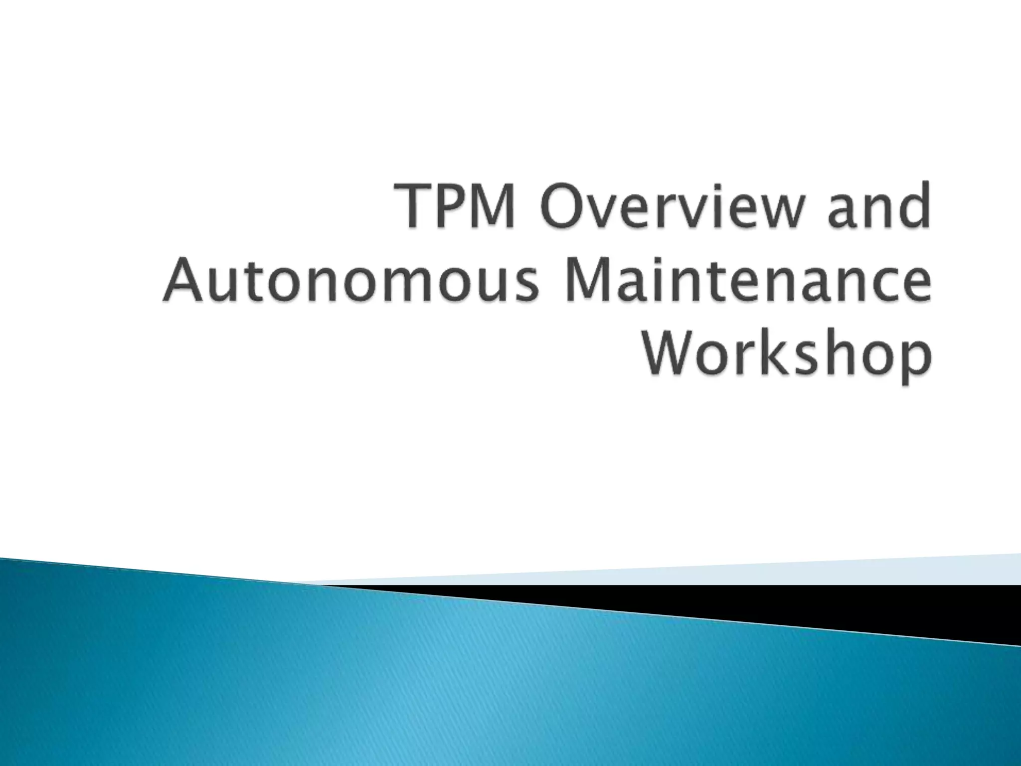 This document outlines the key concepts and implementation of Total Productive Maintenance (TPM). TPM aims to achieve maximum equipment effectiveness through employee involvement between operators and maintenance technicians. It focuses on autonomous maintenance activities performed by operators, such as daily cleaning, inspection and lubrication. The document details the eight pillars of TPM and how autonomous maintenance improves equipment uptime and saves costs when implemented successfully.